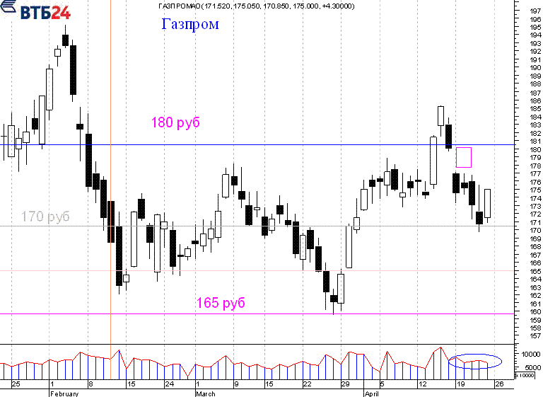 Реализация сильной разворотной модели «расходящиеся свечи» в акциях Газпрома (GAZP) привело к развитию снижения, в ходе которого был достигнута отметка в 170 рублей. От этой отметки последовало резкое движение вверх, проходившее при средних объемах торгов. Это свидетельствует о спекулятивном характере движения, и, скорее всего, вызвано сочетанием действий покупателей и закрытием прибыльных коротких позиций. Эта спекулятивная составляющая не позволяет говорить о долговременном движении вверх, прежде всего, следует иметь в виду незакрытое окно под уровнем в 180 рублей, где можно ожидать останова в движении в связи с фиксацией прибыли спекулянтами, и вряд ли ожидать закрепления выше этой отметки. В целом можно ожидать нахождение цены в текущем коридоре 180 -170 рублей.
