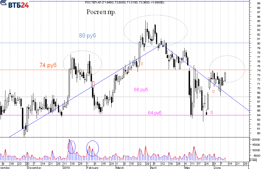 Уменьшившиеся объемы торгов не привели к преодолению котировками привилегированными акциями Ростелекома (RTKMP) уровня в 74 рубля, не был даже достигнут предыдущий максимум в 73.90 рубля. Но это же обстоятельство привело к кратковременному снижению за пределы коридора 70 – 74 рубля, и достижению отметки в 68.22 рубля в ходе торгов 07.06.