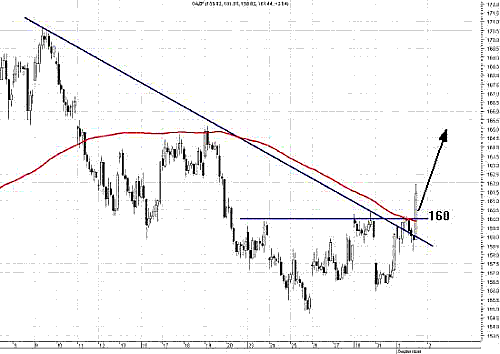 Газпром (GAZP) — уверенно пробивает падающий тренд и сопротивление 160 р./акцию. Покупали. Ближайшие цели — 165 — 170 р./акцию.