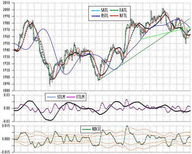 Краткосрочный тренд в индексе РТС стал нейтральным: адаптивная линия тренда SATL направлена горизонтально ниже линии динамического сопротивления RSTL. Опережающий индикатор STLM демонстрирует слабый рост на отрицательной территории, сигнализируя о начале фазы консолидации нисходящей.
