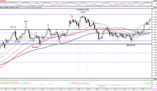 С краткосрочной волновой точки зрения, индекс ММВБ формирует/сформировал сложную восходящую структуру. Так оптимисты ждут роста к 1500-1530 пунктам в рамках зигзаг «abc». В данном случае также возможна корректировка 5-ти волновки в диапазон 1373-1391 пунктов, но не ниже 1355 пунктов, потом снова наверх, что скорее всего уже и происходит.