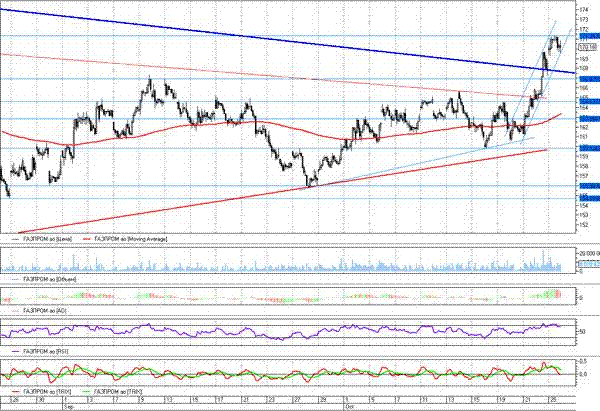 Акции Газпрома на прошлой сессии выросли на 0,62% до 168,49