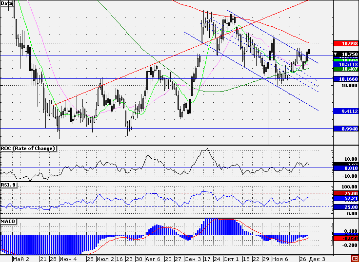 Динамику хуже рынка сегодня демонстрируют акции ММК. Утренние попытки акций закрепиться выше сопротивления 10,8 руб. пока не увенчались успехом. Однако с технической точки зрения продолжение роста все еще возможно. Так, индикатор MACD(12,26,9) близок к переходу на положительную территорию, а индикатор ROC(9) продолжает двигаться в зоне выше нуля. При этом индикатор RSI(9,25%,75%) далек от зоны перекупленности. К тому же недавно акции вышли из нисходящего канала, что также является положительным фактором. В случае если отметка 10,8 руб. все же будет сломлена, то следующей целью станет уровень 11 руб., усиленный близостью 200-дневной скользящей. В противном случае коррекция может быть продолжена. Ближайшей поддержкой является уровень 10,6 руб., далее – 10,5 руб. Таким образом, лонги по бумаге можно рискнуть удерживать, но подтянуть поближе тейк-профиты. Наш 30-минутный торговый робот продолжает удерживать «лонги» от отметки 10,624 руб., но при поступлении негатива робот перевернется.