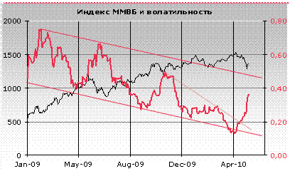 «Второй торговый день подряд индекс ММВБ завершает белой свечой. Историческая волатильность продолжает расти /рис.1/. Индекс ММВБ достиг второй технической цели отскока – уровня нулевой доходности по 20-дневным торговым позициям /индикатор ОВР-20=1386.5 п./.