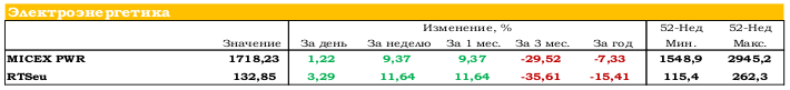 Индекс компаний электроэнергетики MICEX PWR вырос на 1,22%, на РТС отраслевой индекс RTSeu прибавил 3,29%.