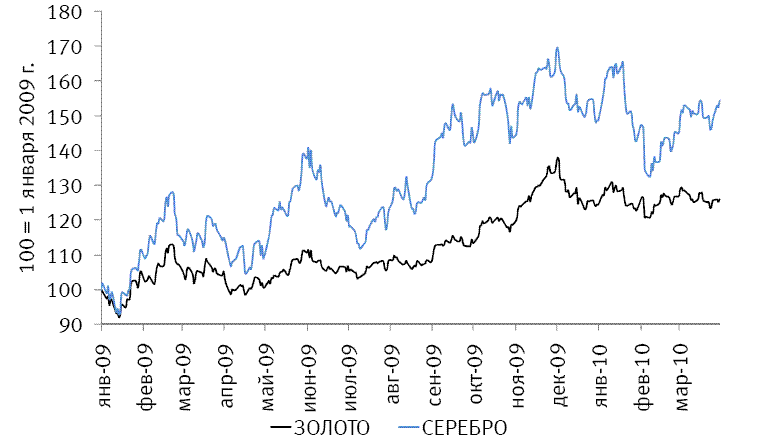 «После рекордов 2009 г., когда на волне долларового carry trade золото обновило исторический максимум на отметке $1,226 за унцию, в январе 2010 г. доминировавший на рынке золота и серебра оптимистичный настрой быстро пошел на убыль. Долговой кризис в Греции коренным образом изменил расстановку сил и перспективы пары евро/доллар, предложения Обамы-Волкера в отношении банковской отрасли подорвали аппетит к риску, а неожиданно скорое ужесточение кредитной политики в Китае вызвало опасения по поводу замедления восстановления мировой экономики. В этих условиях инвесторы в массовом порядке стали закрывать позиции в рисковых активах, включая серебро и золото, а отношенье к доллару с негативного в одночасье изменилось на позитивное.