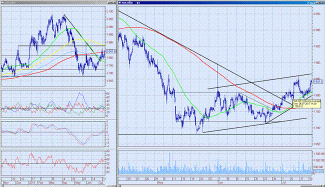 Сегодня мы рекомендуем играть от уровня 1850 руб. сокращая длинные позиции в зоне 1850-1855 руб. восстанавливая в зоне 1820-1830 руб. стоп перенести с 1785 руб. 1800 руб. В случае пробоя вверх 1855 руб. восстановить лонги со стопом 1840. Более долгосрочная цель повышения зона 1910-1880 руб.