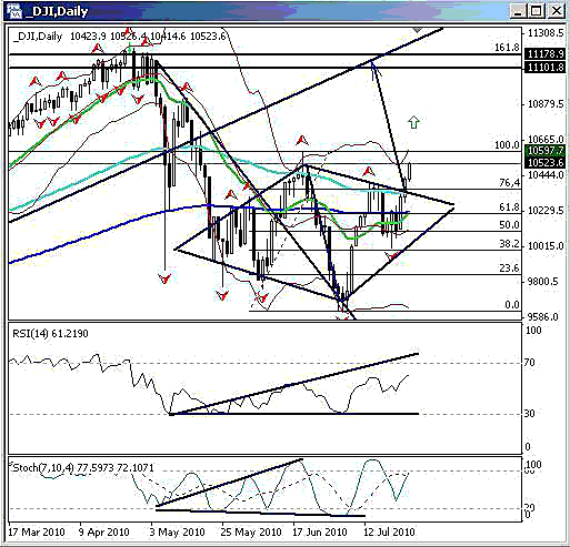 Если ориентироваться на всё тот же западный рынок, то для индекса DJ таким рубежом является более высокий фрактал на покупку, расположенный на уровне 10593,9 пунктах на пике 21 июня; для индекса S&P аналогичным уровнем является отметка 1131,23 пунктов.