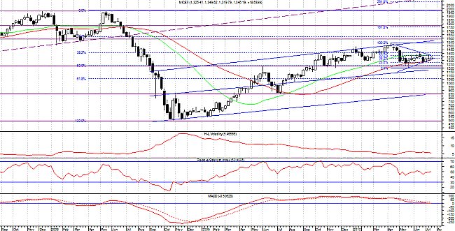 На дневном графике отчетливо видно, что индекс ММВБ, благодаря сегодняшнему «гэпу» вверх, вышел за пределы более чем трехмесячного треугольника и усилил движение вверх, что важно сопровождаемое ростом объемом. Таким образом, сегодняшняя среда может оказаться важным днем с точки зрения определения среднесрочных перспектив рынка. По сегодняшнему закрытию можно будет судить, действительно ли рынок вышел из затянувшейся консолидации и подал сигнал на новый восходящий тренд.