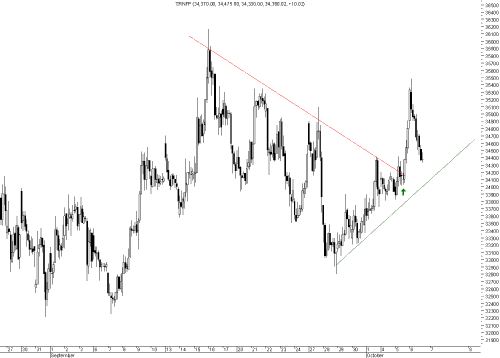 Мы также добавляли акции Транснефти (TRNFP), которые менее привлекательны, чем ВТБ, но обладающие определенным потенциалом роста. Вчерашняя коррекция внутри дня показала, что они значительно слабее ВТБ, однако соотношение риск/доход при текущих ценах здесь очень удачное, ведь наш стоп стоит на уровне 33 500 руб.