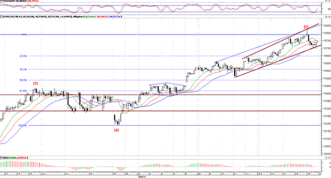 Оптимисты считают, что идет формирование 5-ой волны, которая развивается в виде флага/треугольника, дивергенция подтверждает наличие 5-ой волны. Исходя из этого, индекс сначала продолжит двигаться в рамках восходящего тренда, а затем выйдет из него вниз и как минимум откорректирует текущий рост, в район 10400-10550 пунктов.