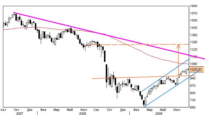 Ближайший уровень сопротивления на недельном графике S&P 1150 пунктов, ближайший уровень поддержки 940 пунктов.