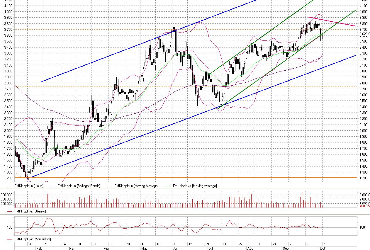 С технической точки зрения акции ГМК «Норильский никель» не выглядят, как лакомая добыча для «быков». Они в пятницу пробили линию восходящего тренда от 13 июля 2009 года – 3625 рублей, и пока не желают за нее возвращаться. Вдобавок, тренд на индикаторе «Momentum» направлен резко вниз.