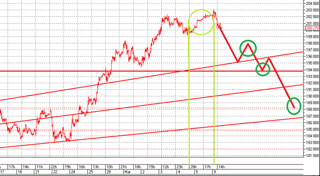 На текущий момент, стоит удерживать в «короткую» позицию от 202000-200000 пунктов по мартовскому фьючерсу на индекс РТС, или же стоит перенести позиции в июньский фьючерс, учитывая спрэд в 2000 пунктов между ними. Цель данной позиции остается та же, нижняя граница канала, которая будет соответствовать 185000-188000 пунктам, но я не исключаю продолжения «медвежьего» тренда на рынке, который характерен для марта-апреля.