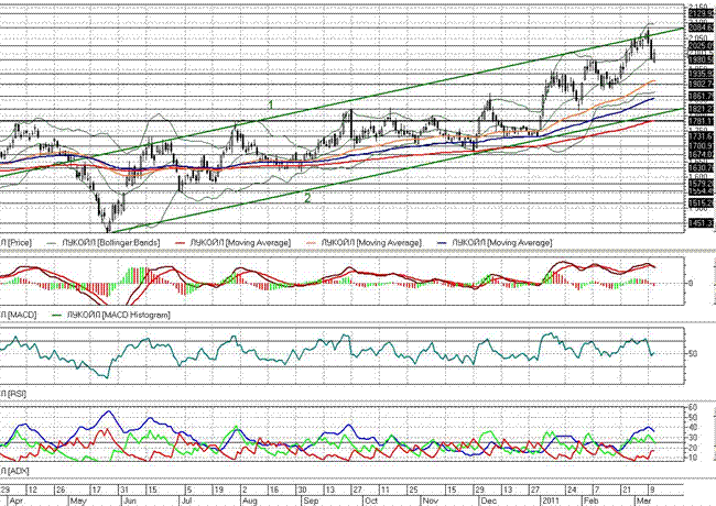 Таким образом, коррекционное снижение акций Лукойла в ближайшие несколько дней может продолжиться, что пошло бы на пользу бумагам перед продолжением среднесрочного роста. Однако краткосрочные «короткие» позиции стоит открывать лишь в случае закрепления котировок ниже поддержки 1980 руб, возле которой расположена также средняя полоса Боллинжера. Пробитие поддержки может привести к падению в район 1860-1900 руб /линия EMA55 дневного графика и нижняя полоса Боллинжера/. Среднесрочные перспективы бумаг при этом остаются положительными».