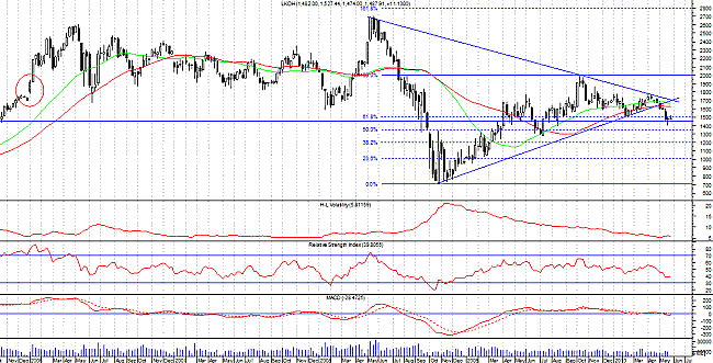 «Уже более чем полугода акции «Лукойла» (LKOH), так же, как и российский фондовый рынок, находятся в консолидации. Главной особенностью бумаг нефтяной компании является среднесрочный боковик с мягкой тенденцией вниз. На дневном графике отчетливо видно, что акции «Лукойла» покинули предыдущий восходящий канал и предприняли попытку выйти их консолидационного треугольника вниз, пробив в середине мая поддержку в 1600 руб. Движение на выносе «стопов» у покупателей получило продолжение, и бумага просела еще на 200 руб.