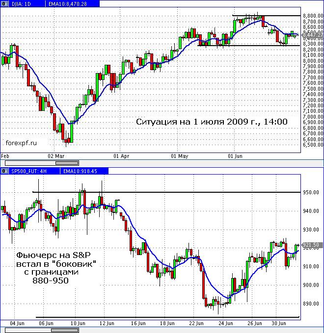 Американские индексы из восходящих каналов вышли в «боковики». У индекса Доу границы торгового коридора просматриваются вблизи уровней 8250-8800, а фьючерс на S&P встал в зону 880 — 950. Сейчас оба инструмента движутся от нижней границы к верхней и уже находятся примерно в середине каналов. Место не самое идеальное для проведения долгосрочных операций, но до цели вверху всё же довольно далеко. В середине канала индексы могут развернуться и вниз с целью у нижней границы. В зависимости от новостного фона, планировать можно как длинные, так и короткие краткосрочные позиции. Кроме того, в краткосрочном плане направление движения индекса в значительной степени определяет наклон скользящего среднего ЕМА(10) на часовом графике.