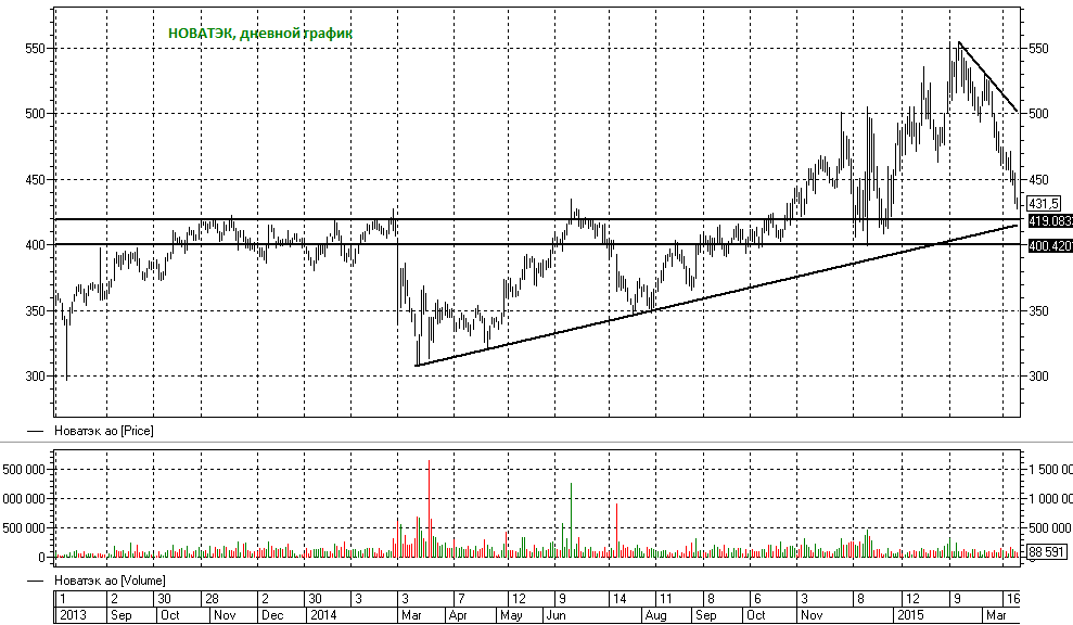 В феврале 2015 года акции «НОВАТЭКа» поставили вершину около 550 рублей, после чего упали к настоящему моменту к 430 рублей. Учитывая наличие восходящего тренда, а также широкой зоны поддержки в районе 400-420, мы рекомендуем искать возможности для покупок.