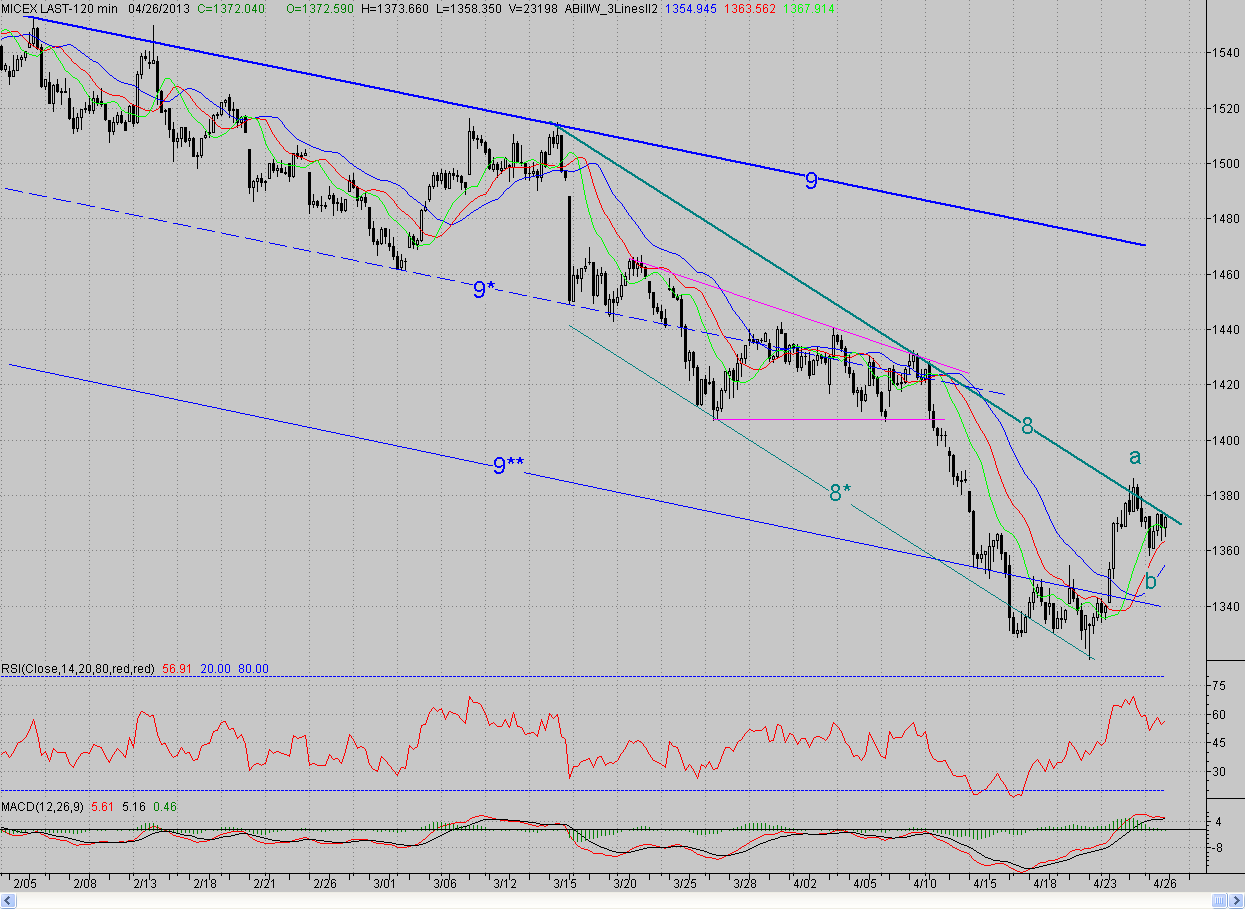 Исследуя 2-часовой график индекса ММВБ, видим, что на умеренно-негативном внешнем фоне котировки открылись с небольшим понижением и продолжили движение на Юг. Однако «медведи» наступали явно без агрессии, в результате чего выстояла одна из ближних поддержек в лице уровня 38%-ной коррекции от волны роста последних дней (~1360 п.). От этого редута «быки» повели контрнаступление, но и у них особого энтузиазма не было, и единственное, чего они добились, это закрыли утреннее окошко и протестировали среднесрочный падающий тренд (8), где в итоге и произошло закрытие дня. Таким образом, хотя «быки» сумели переломить утреннюю негативную тенденцию и полностью отыграть просадку первых полутора часов, но реализовать свою дневную задачу и закрыть день уверенно выше тренда (8) они не смогли.