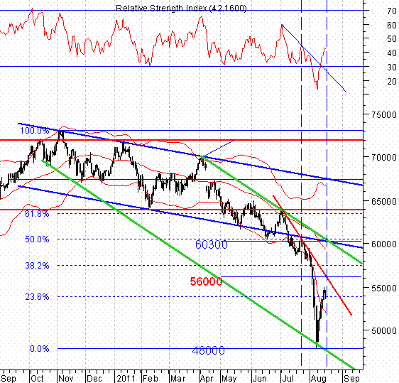 Обстановка на развивающихся рынках по-прежнему нервозная. К примеру, 11.07.11 бразильский фондовый индекс Bovespa «выпал» вниз из понижающегося канала, сформированного в конце прошлого года. В данное время он находится в более агрессивном снижающемся канале с нижней границей 48000. Сценарии могут быть любыми, но этот индекс выглядит слабо. Ситуация исправиться, но не ранее чем он преодолеет отметку сопротивления 63000. Вероятно, что подъем рынка будет ограничен уровнем 56000 – район прохождения нисходящего тренда /красная линия/.