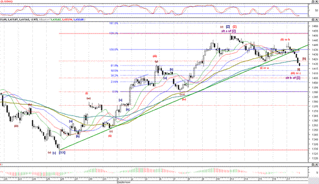 Итак, 13 сентября индекс ММВБ достиг расчетного уровня 1452 пунктов, что составляет 138.2% по Фибоначчи в рамках формирования или 5-ой малой волны или волны z в тройном зигзаге в рамках большой 2-ой волны.