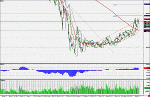 После столь значительной просадки акции ВТБ могут отскочить вверх. Значимым сопротивлением является 4,5 коп. за акцию, в случае пробития данной отметки рекомендую открыть позиции. Целью станет 4,74 коп., вблизи данного уровня рекомендую закрыть позиции. В случае негативных настроений акции могут устремиться к нижней границе восходящего тренда – 4,03 коп. В данном случае рекомендую открыть позиции по акциям ВТБ, поскольку около отметки 4 коп. сосредоточено несколько уровней поддержки, которые вряд ли будут пробиты.