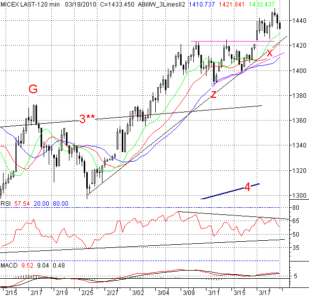 Исследуя 2-часовой график индекса ММВБ, видим, что вчера с утра «медведи» попытались провести атаку. Но начавший улучшаться внешний фон не дал этим планам реализоваться. Более того, котировки развернулись и возобновили рост, в результате которого не только преодолели максимум среды, но и, можно сказать, достигли цели роста в лице высоты «треугольника» /1450-1455 пп./, про которую мы писали предыдущие два дня /здесь же находится и февральский максимум/. От данного района пошли продажи, и индекс растерял всю высоту набранную за первую половину торгов. В итоге закрытие произошло в небольшом минусе.
