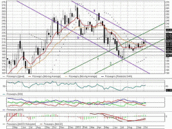 Недельный график говорит о том, что для выхода из нисходящего канала акциям Роснефти потребуется завершить текущую неделю как минимум выше 209 руб, но в целом дает оптимистичные сигналы. Индекс RSI растет в средней зоне, EMA9 и EMA21 направлены вверх и близки к пересечению, что служило бы сигналом на покупку. ADX говорит о преобладании восходящего тренда, который набирает силу, в то время как гистограмма MACD растет на положительной территории, а линии MACD после пересечения идут вверх на отрицательной.