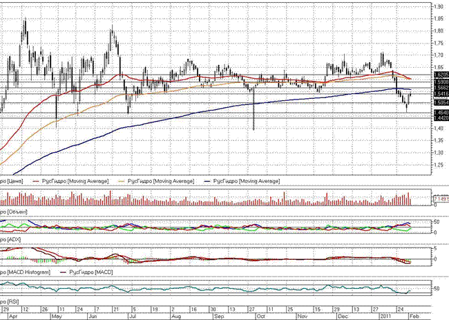 «Акции РусГидро (HYDR), после довольно долгого пребывания во флэте, начали новый 2011 год с пессимистичной ноты и, в отличие от всего рынка, обновили не локальные максимумы, а минимумы. Однако в ходе торговой сессии 31 января бумагам удалось «отскочить» от поддержки 1,46 руб и, преодолев сопротивление 1,5 руб, направиться выше, приостановив рост у отметки 1,54 руб.