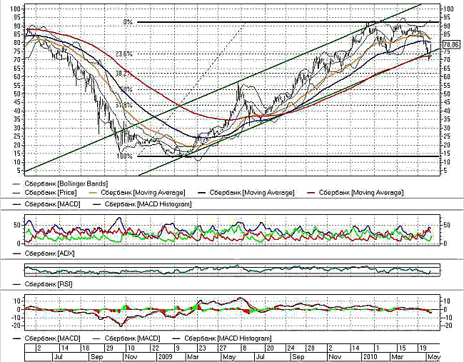 Таким образом, исходя из анализа недельных и дневных графиков Сбербанка, можно сделать вывод о том, что котировки на настоящий момент находятся у значимых уровней поддержки и сопротивления, преодоление которых может указать на направление дальнейшего среднесрочного тренда.