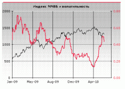Индекс ММВБ в последние пару дней балансирует в 3%-ном диапазоне вокруг 20-дневной балансовой цены /ОВР-20=1317 п./. Спекулянты пока остаются в замешательстве – не понятно, в какую сторону открывать позиции при том, что среднесрочный тренд остается медвежьим. Индикатор исторической волатильности по индексу ММВБ продолжает снижаться /рис.2/. Совокупность признаков всё больше говорит в пользу развития сценария бокового движения, что, однако, не исключает всплесков волатильности с целью расширения торгуемого ценового диапазона. Структура рынка, похоже, начала меняться, однако на рынке всё ещё доминирует краткосрочный спекулятивный интерес».