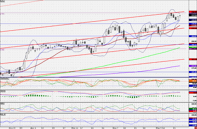 Акции накануне протестировали локальное сопротивление 225,00 руб., от которого наметились распродажи. При пробитии вверх данной отметки акции нацелятся на максимум года – 226,89 руб. Поддержкой является 10-дневная скользящая средняя – 220,42 руб.