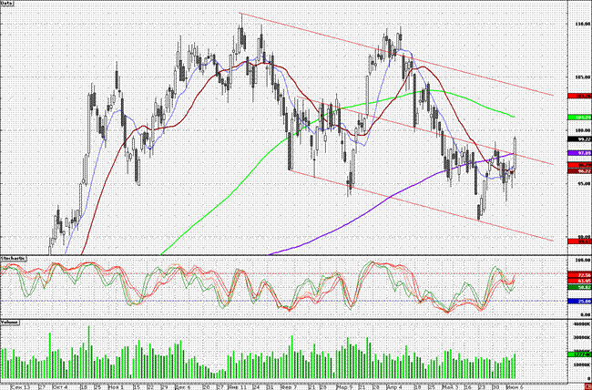 Сопротивлением является психологическая отметка 100,00 руб., в районе которой длинные позиции стоит сокращать. Поддержкой является 200-дневная скользящая средняя – 97,89 руб., от данной отметки стоит совершать покупки.