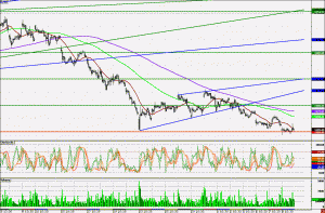 По итогам вчерашней сессии акции ВТБ потеряли в стоимости 3,45%. Ослабление российского рубля может на открытии увести бумаги в минус, однако близость уровня поддержки в виде нижней границы нисходящего краткосрочного тренда будет препятствовать торговле на понижение. В случае пробития данного уровня вниз откроется цель 3,25 коп. Уровнем сопротивления является отметка 3,38 коп. – нижняя граница бокового канала, в случае пробития которой акции протестируют уровень сопротивления 3,41 коп. – верхнюю границу нисходящего канала.
