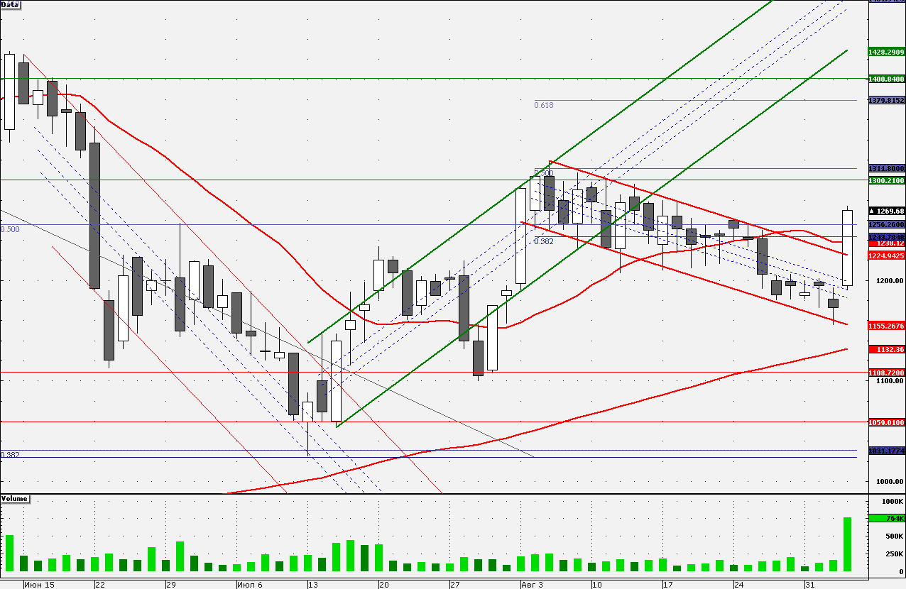Акции «Полюс Золото» в ходе вчерашней сессии выглядели лучше рынка, отыгрывая позитив с сырьевого рынка, а именно взлёт котировок золота, в результате акции пробили верхнюю границу нисходящего канала, в котором двигались с начала августа. По итогам сессии акции прибавили 8,24%, завершив день на уровне 1269,68 руб.