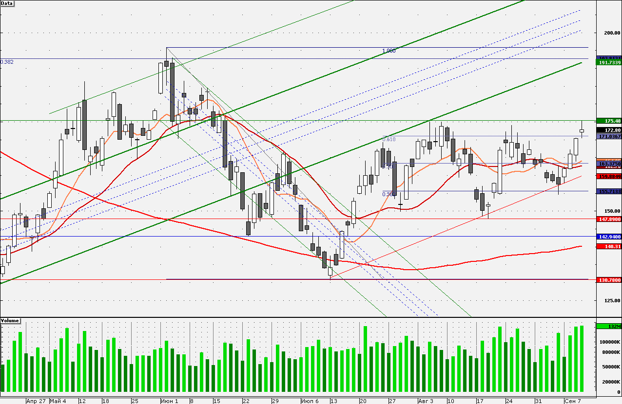 Бумаги «Газпрома» накануне выглядели лучше рынка, отыгрывая позитив с сырьевого рынка. Акции пользовались спросом и со стороны нерезидентов, что подтверждается значительным ростом АДР на акции компании. Сопротивлением в ходе сессии выступил максимальный уровень августа. По итогам дня бумаги закрылись на отметке 172,80 руб., прибавив 1,432%.