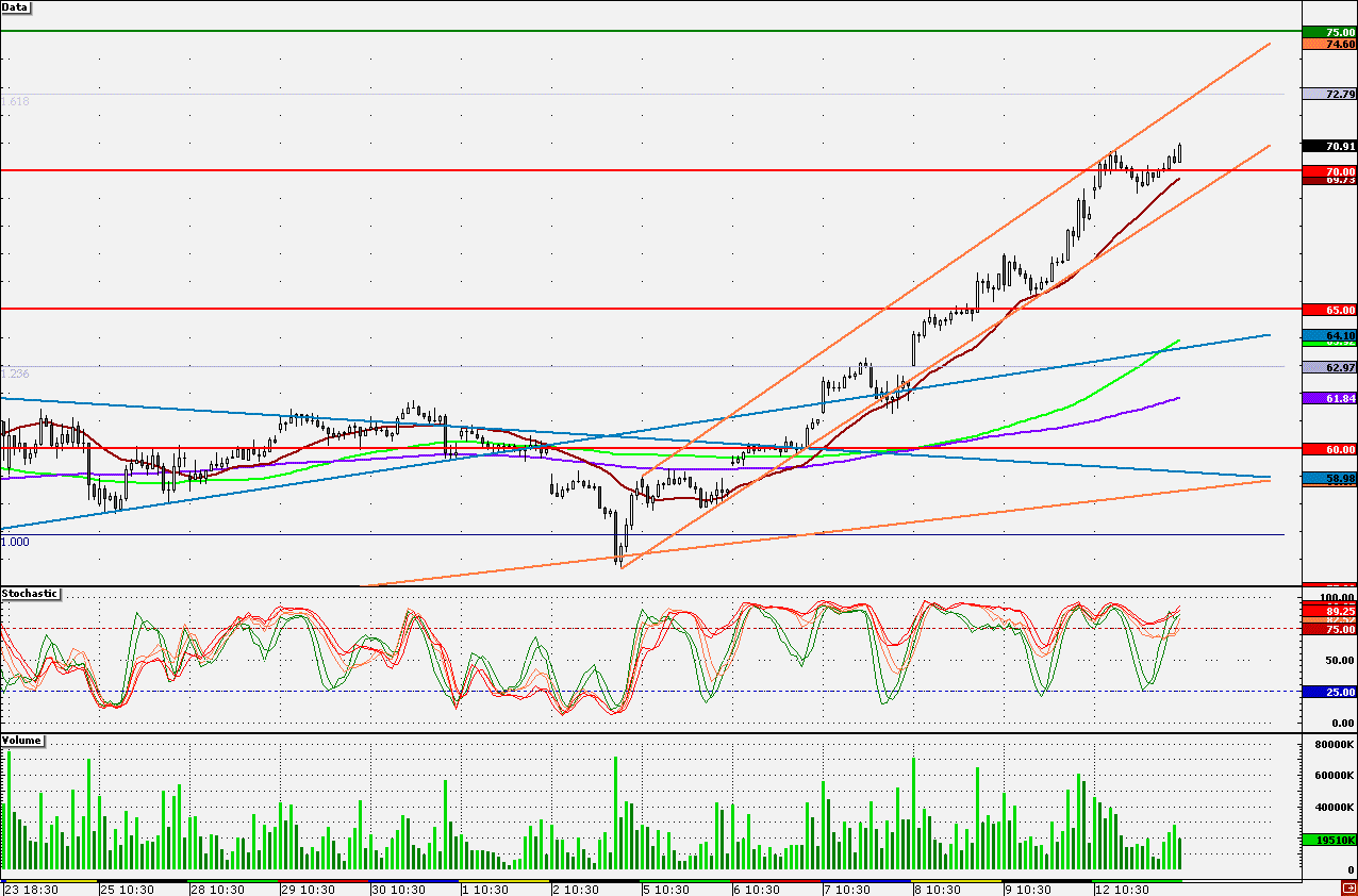 Акции Сбербанка накануне закрылись в плюсе на 3,624%. Бумаги продолжают торговаться в краткосрочном восходящем канале. Сегодня внешний фон способствует нейтральному открытию. Рекомендую открыть короткие позиции при тестировании верхней границы канала (72,4 руб.). Открывать длинные позиции рекомендую у нижней границы (69,1 руб.) с целью достижения верхней границы канала. Однако при текущих высоких уровнях открывать длинные позиции рискованно.