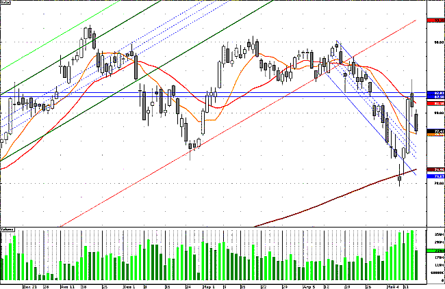 Внешние сигналы для бумаг банковского сектора носят негативный характер, что способствует продолжению продаж. Ближайшая поддержка, которая может быть пробита уже на открытии лежит на уровне 10-дневной скользящей средней, пробитие вниз данного уровня открывает потенциал к снижению к уровню 75 руб. Ближайшее сопротивление по акциям Сбербанка при смене настроений лежит на верхней границе нисходящего канала.