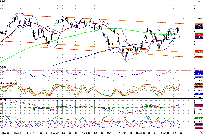 По акциям банка накануне был символически передвинут локальный максимум на отметку 84,72 руб., которая сегодня выступит в роли сопротивления. Внешний фон способствует довольно нейтральному открытию. Ближайшей поддержкой является 83,00 руб., в район данной отметки акции могут опуститься в ходе фиксации прибыли в ожидании публикации статистики и отчетностей. Пока район локальных максимумов /ниже 85,00 руб./ удерживается, что не способствует открытию длинных позиций. В случае пробития вверх отметки 85,00 руб. целью по акциям станет верхняя граница нисходящего тренда – 86,79 руб.
