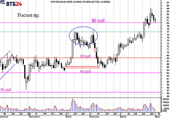 Новый рост объемов в ходе торгов 29 марта привел к росту цены привилегированных акций Ростелекома (RTKMP) до отметки в 84 рубля, однако стоило объемам снизиться, как цена вернулась к уровню в 80 рублей. Развитие ситуации похоже на движение, которое происходило в январе 2009 года в виде формирования модели «башня». Две свечи за 29 и 30 марта образуют разворотную модель «пинцет», здесь также можно говорить о модели типа «харами» с подтверждением.