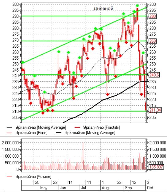 Бумаги Уралкалия сильно просели в связи с негативным внешним фоном. На данный момент, пробив 200-дневную скользящую среднюю, акции торгуются около уровня поддержки в 210 руб. В случае преодоления данной отметки рекомендуем сократить количество бумаг в своём портфеле.