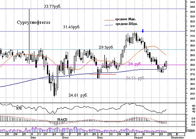Закрепление цены акций Сургутнефтегаза (SNGS) выше отметки в 28 рублей говорит в пользу проторговки уровня сопротивления в 28,5 рубля.