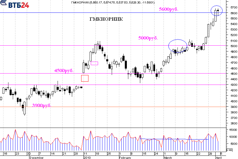 Уровень локального максимума января 2010 года в акциях ГМК Норильский никель (GMKN) не привел к задержке в движении цены вверх, которая копировала динамику изменения стоимости металла никеля. В результате цена превысила отметку в 5600 рублей, и только тогда появились признаки останова. Почти равенство максимумов 01 апреля /5674.46 рубля/ и 2 апреля /5674.75 рубля/ позволяет говорить о модели «пинцет».