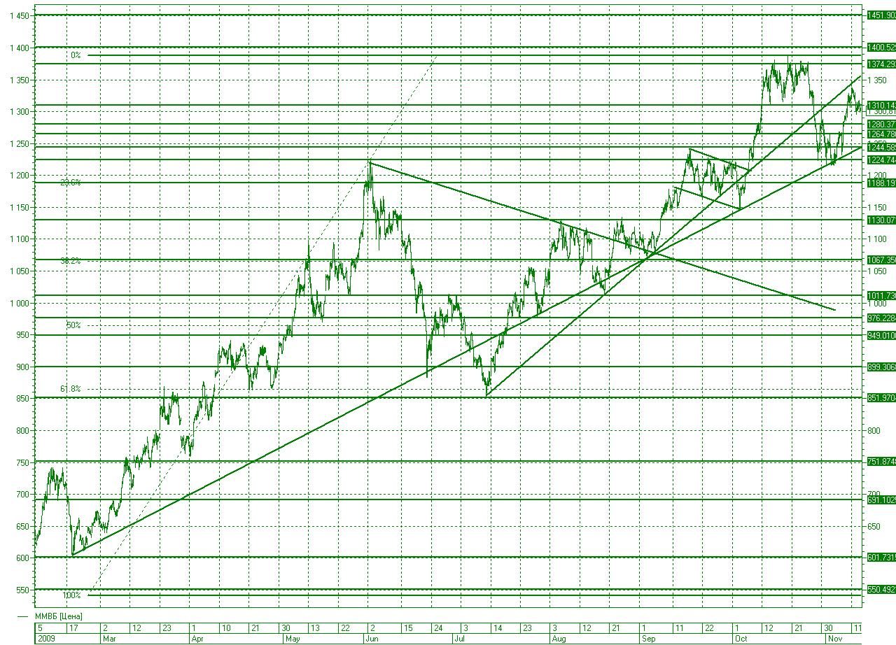 В настоящий момент рынок продолжает отрабатывать диапазон 1300-1330 пунктов. Для продолжения роста необходимо преодолевать сопротивление в районе 1330-1340 пунктов. В этом случае следующее сопротивление расположено на 1360 пунктах. Пробой 1290-1300 пунктов способен привести к продажам с целью на 1270.