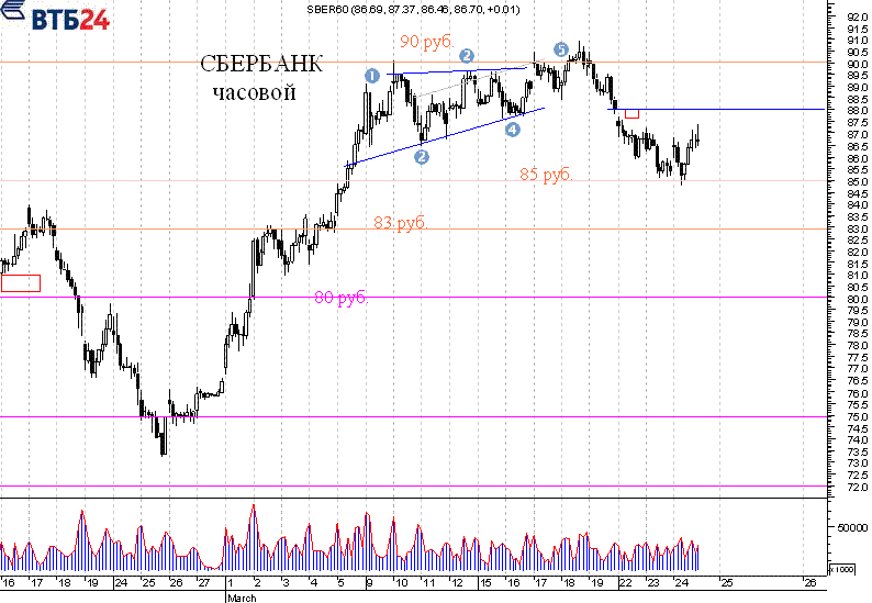 Кроме того, в начале торгов 22 марта произошло образование окна, которое до текущего момента так и не закрыто. Снижение остановилось на отметке в 85 рублей, и после 4-х дней снижения стала развиваться коррекция вверх.
