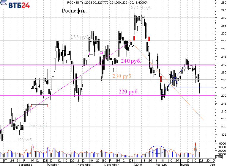 Движение вниз котировок Роснефти (ROSN) в рамках понижательной тенденции получило развитие, и цена продолжила снижение в рамках проторгованного коридора 240 – 220 рублей. В начале торгов 22 марта был образовано окно, однако попытка движения вверх и закрыть образованное окно не удалась.