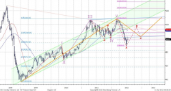 Во второй половине марта текущего года было завершено формирование фазы роста, которая началась с первых дней 2009 года. В настоящее время формируется плоская коррекция, как следует из графика 2. Минимальная точка коррекции уже достигнута. Ждем роста котировок Brent к отметке $115.