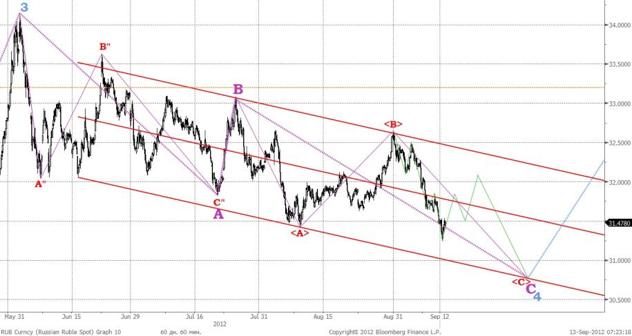 Пара доллар/рубль продолжает формировать волну <С> в волне С и достигла вчера отметки 31,2485 (см график 7). Полагаем, в ближайшее время соотношение доллара и российской валюты повысится до отметки 32 рубля, после чего укрепление рубля может продолжится и достигнуть уровня 31 – 31,8. Предполагаемая структура динамики соотношения доллара США и российской валюты в среднесрочной перспективе изображена на графиках 7 и 8.