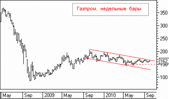 «Уровень сопротивления прошлого года в 200 р. так и остался не взятым. Последующие попытки прорыва котировками акций Газпрома (GAZP) оказывались даже ниже предыдущих. Постепенно цена начала снижаться, и движение оформилось в виде канала. Верхняя граница выдерживается более четко.