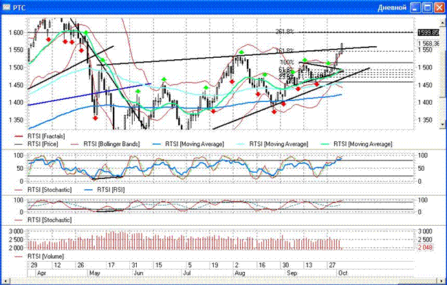 Сознаюсь, что пыталась вчера «пошортить» фьючерс на индекс РТС, но уже на вечерней сессии, я поняла, что в данном случае технический анализ вторичен. Фьючерс на индекс РТС несся как локомотив, у которого отказали тормоза и я не удивлюсь, если мы сегодня увидим 1600 пунктов по самому индексу.